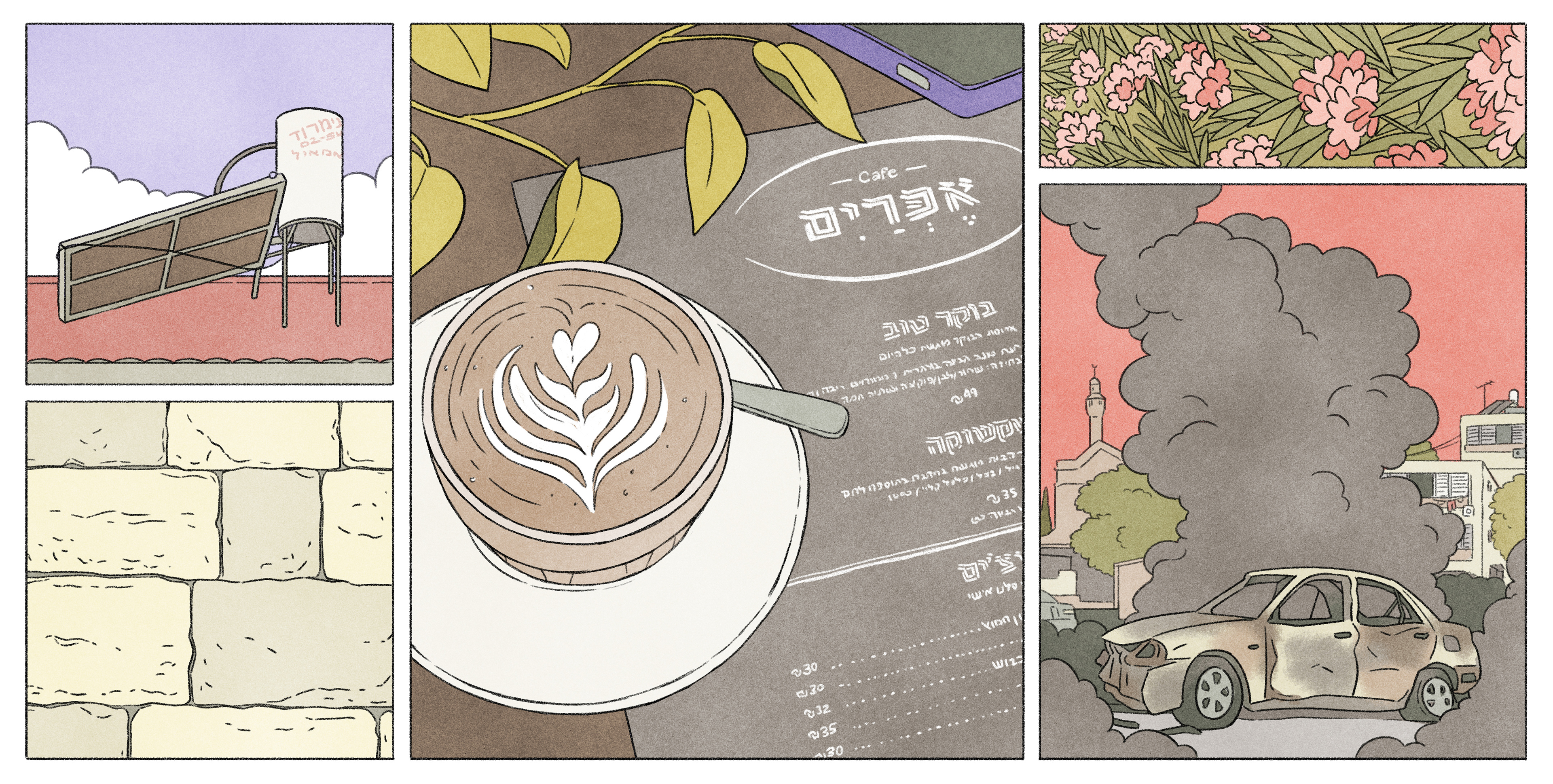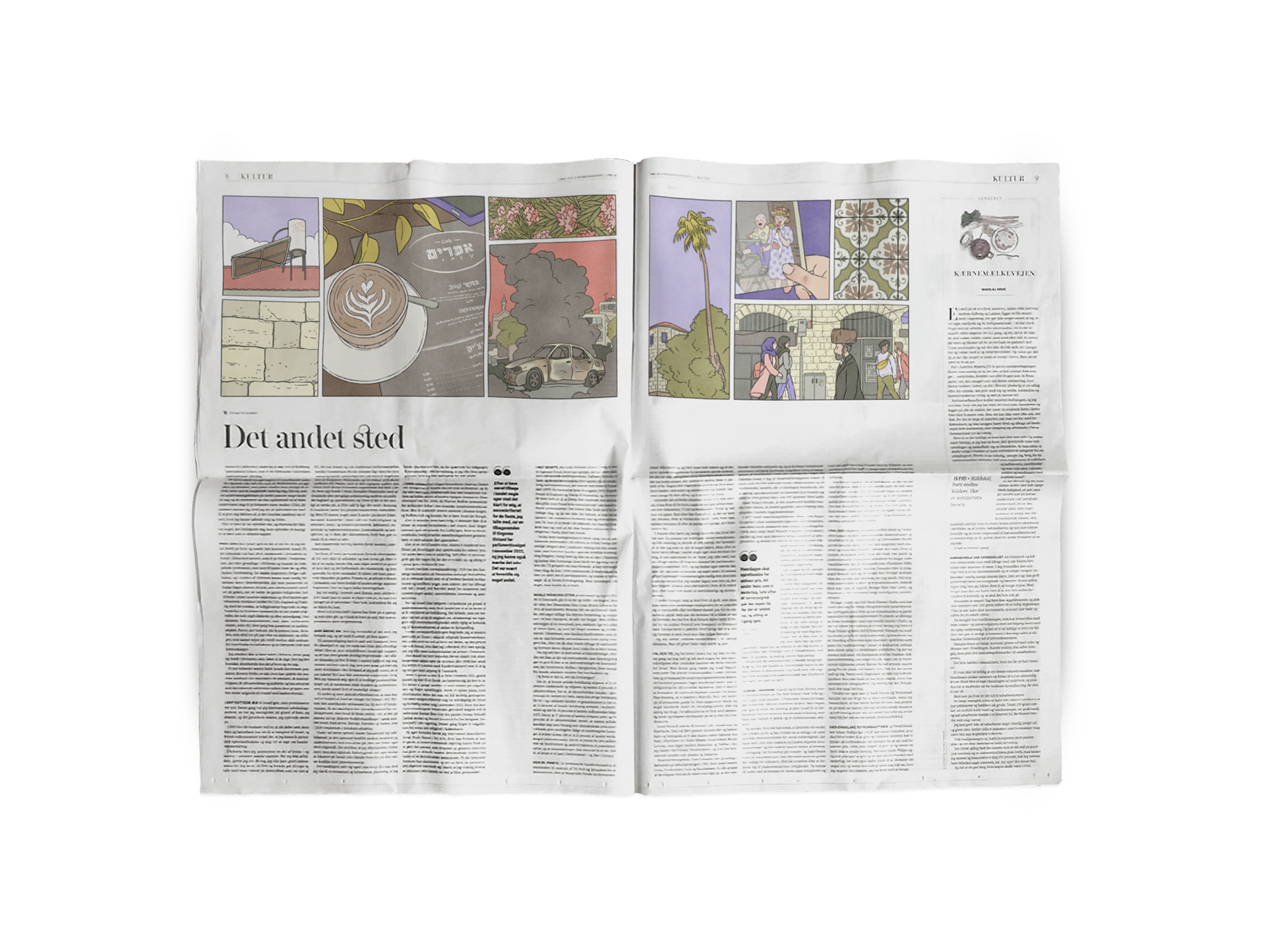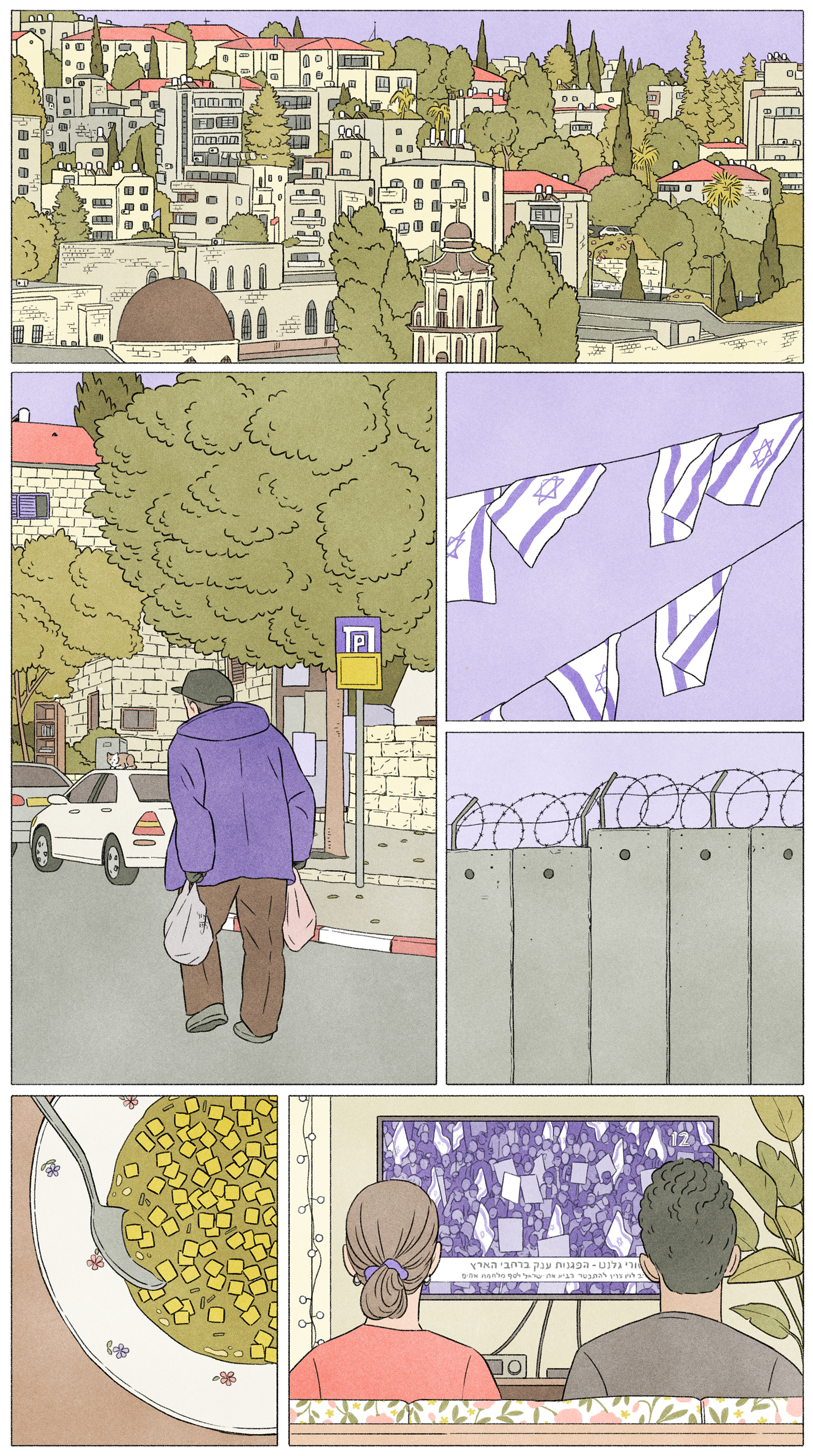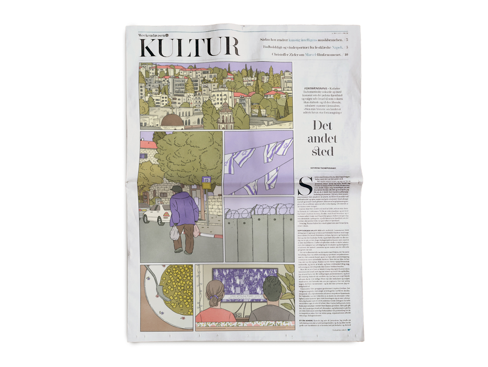 Cover and spread illustrations for an article by Katherine Tschemerinsky about having a complicated relationship with Israel. AD: Mie Brinkmann